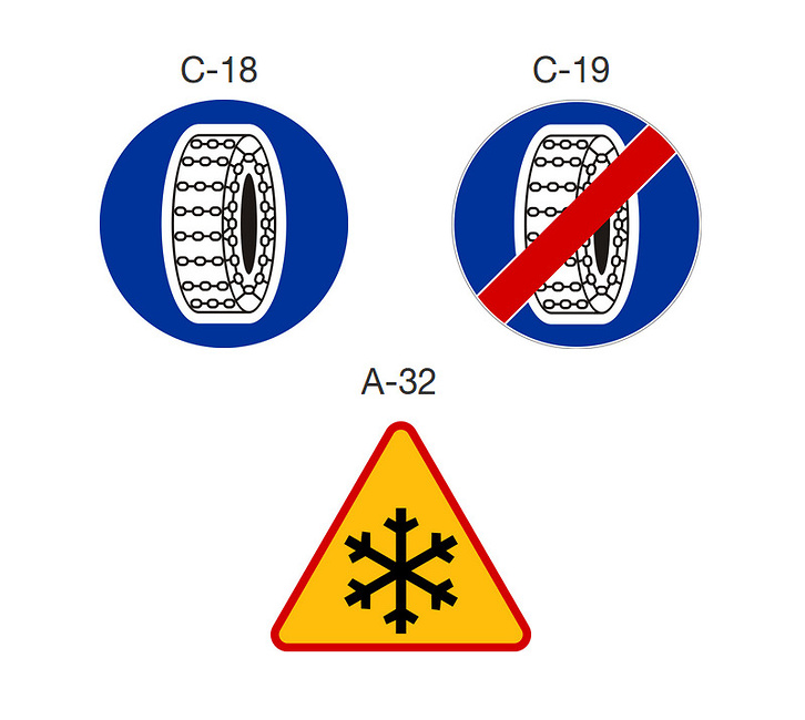 • znak nakazu „nakaz używania łańcuchów przeciwślizgowych” (C-18);